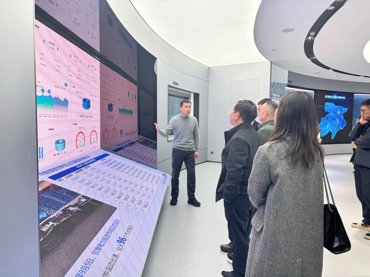 周毅一行参观了智网AI中心展厅,详细了解了智网公司在能源数字化、物联网以及虚拟电厂平台等领域的核心技术、产品矩阵与落地案例。