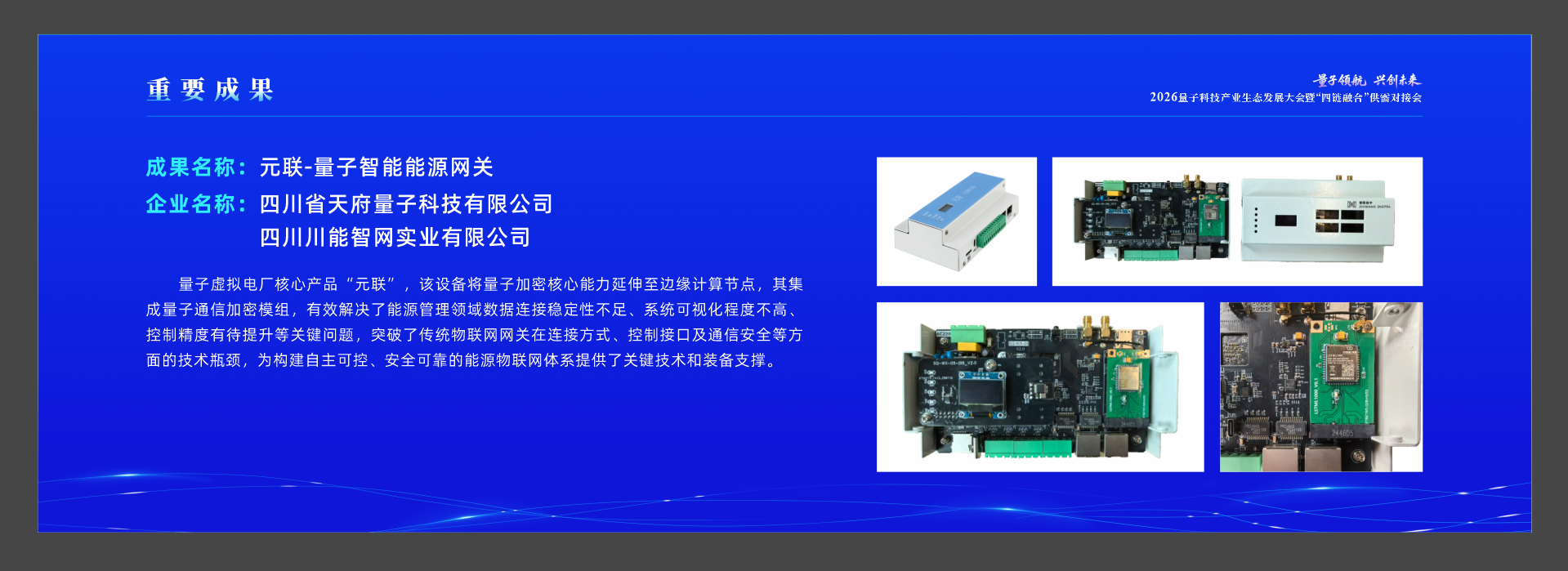 四川川能智网实业有限公司(简称“智网公司”)的量子虚拟电厂核心产品“元联”在本次大会上首次亮相,同时“智网锦江量子虚拟电厂”项目正式签约并入驻四川省量子科技产业的核心载体——量子科技大厦。